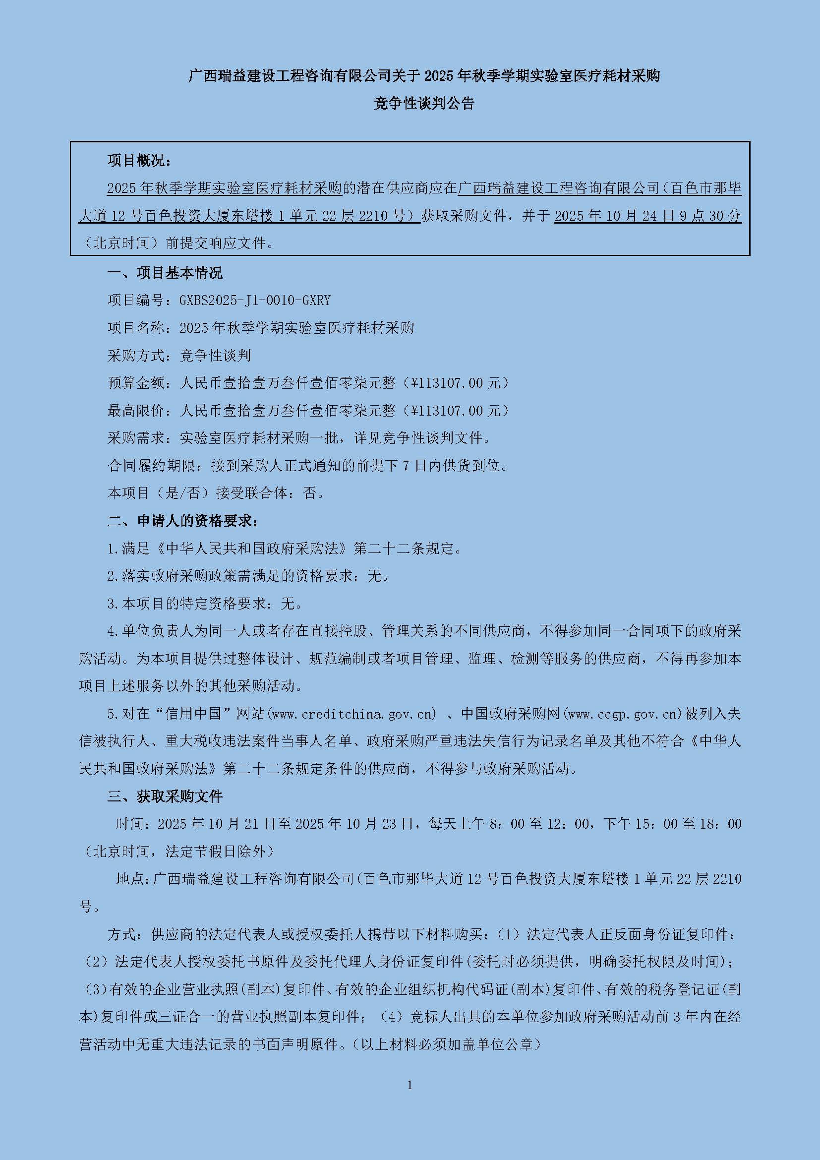 广西瑞益建设工程咨询有限公司关于2025年秋季学期实验室医疗耗材采购竞争性谈判公告