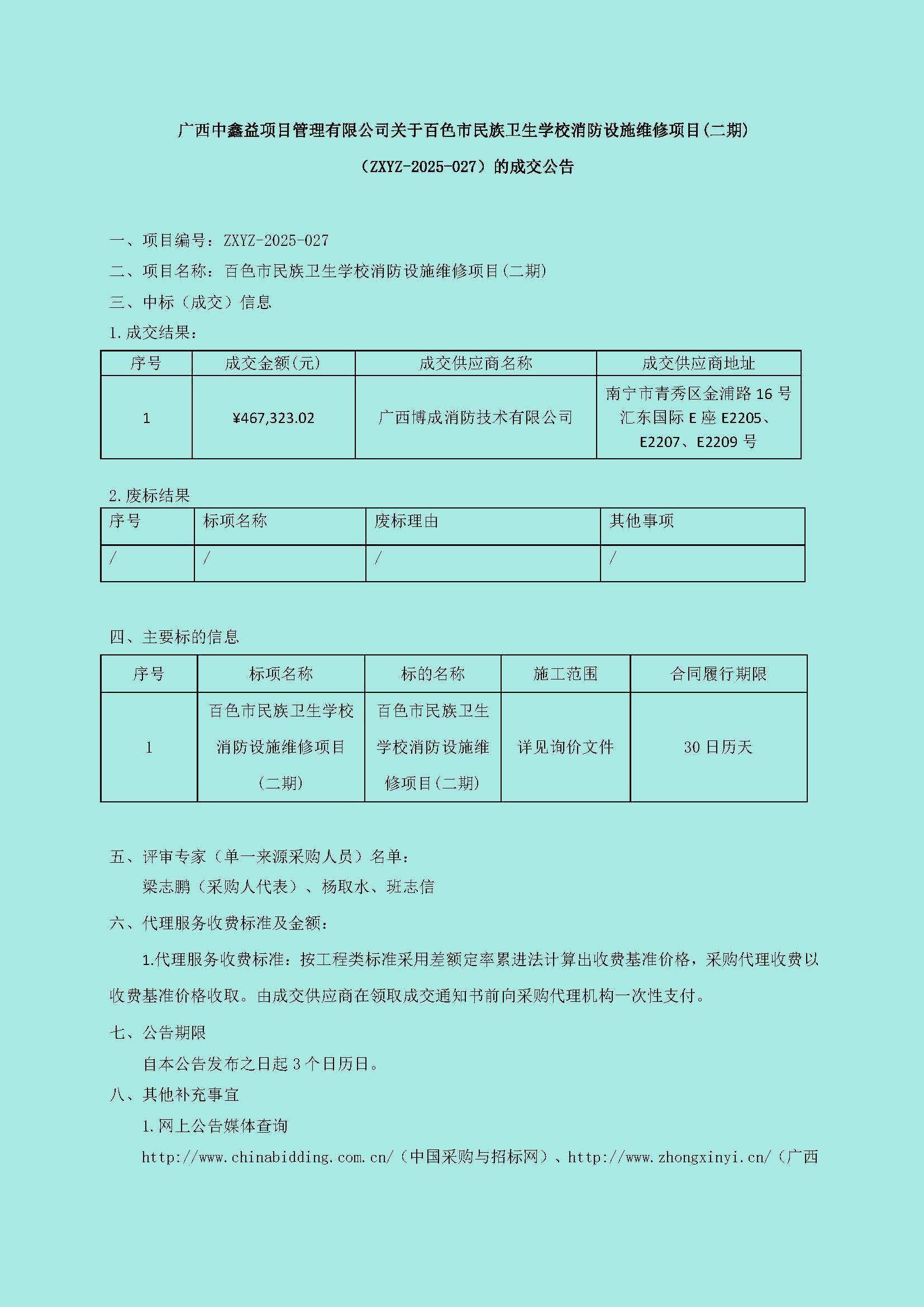 广西中鑫益项目管理有限公司关于百色市民族卫生学校消防设施维修项目(二期)(ZXYZ-2025-027)的成交公告